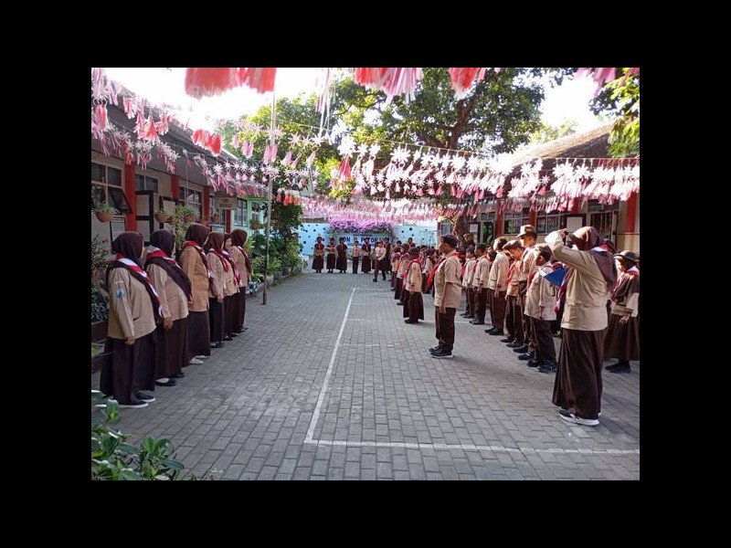 seluruh peserta didik dan dewan guru melaksanakan upacara bendera untuk memperingati hari pramuka yang ke 64