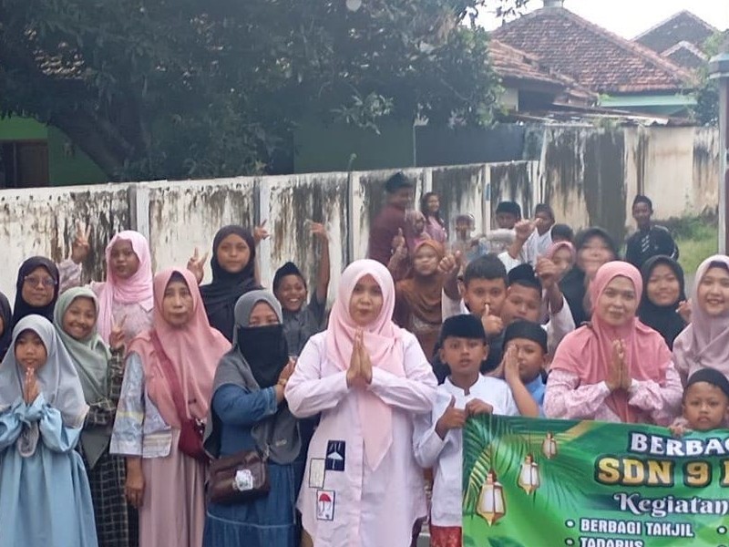 Peserta didik kelas 3,4,5, dan 6 serta Dewan guru melaksanakan kegiatan pembagian takjil, tadarus, buka bersama, dan sholat maghrib di halaman SDN 9 Patokan